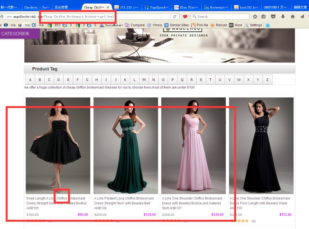 这个是长尾词为Cheap Chiffon Bridesmaid Dresses页面,根据参数Chiffon搜索到的产品