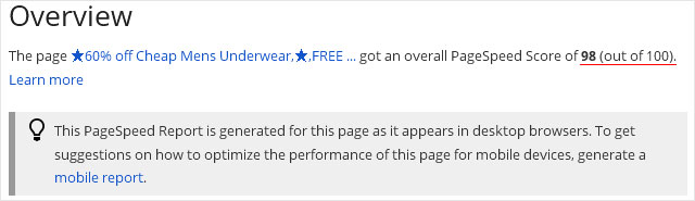 在这里,需要先说一下:什么是谷歌的页面高速在线?答:“页面高速在线分析网页的内容,然后生成建议,使该网页的速度更快,减少页面载入时间可以降低跳出率,提高转换率。”简单的说,就是一个优化网页速度的工具,可以测试网页速度,给网页打分,生成需要改善的建议。此站用谷歌的页面高速在线测试,得分很高:98.